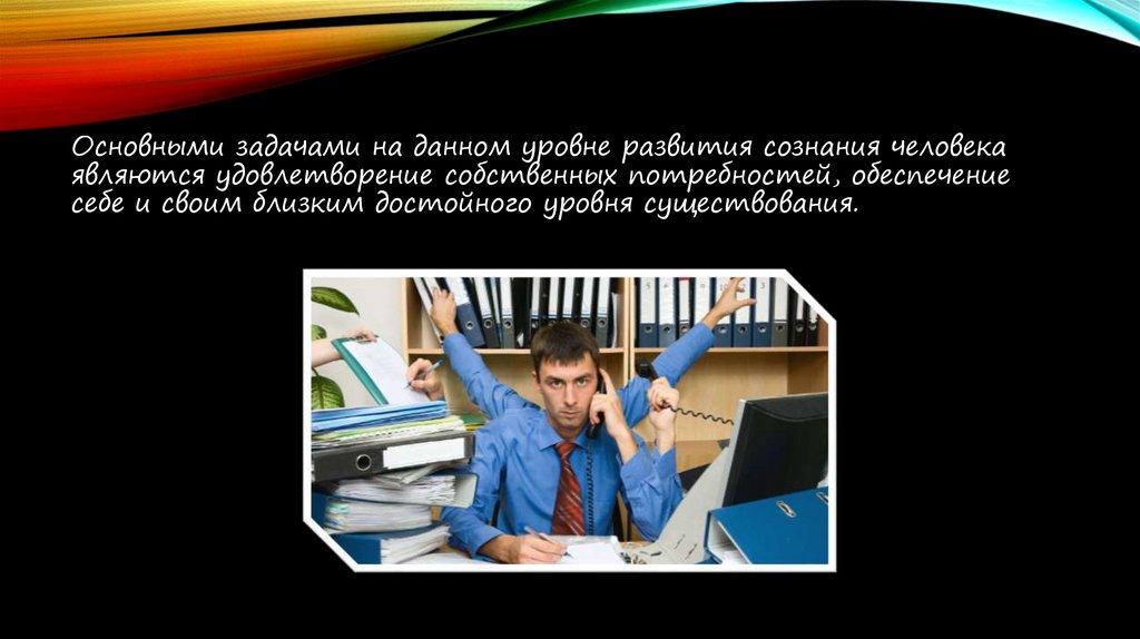 Основными задачами на данном уровне развития сознания человекаявляются удовлетворение собственных потребностей, обеспечение
