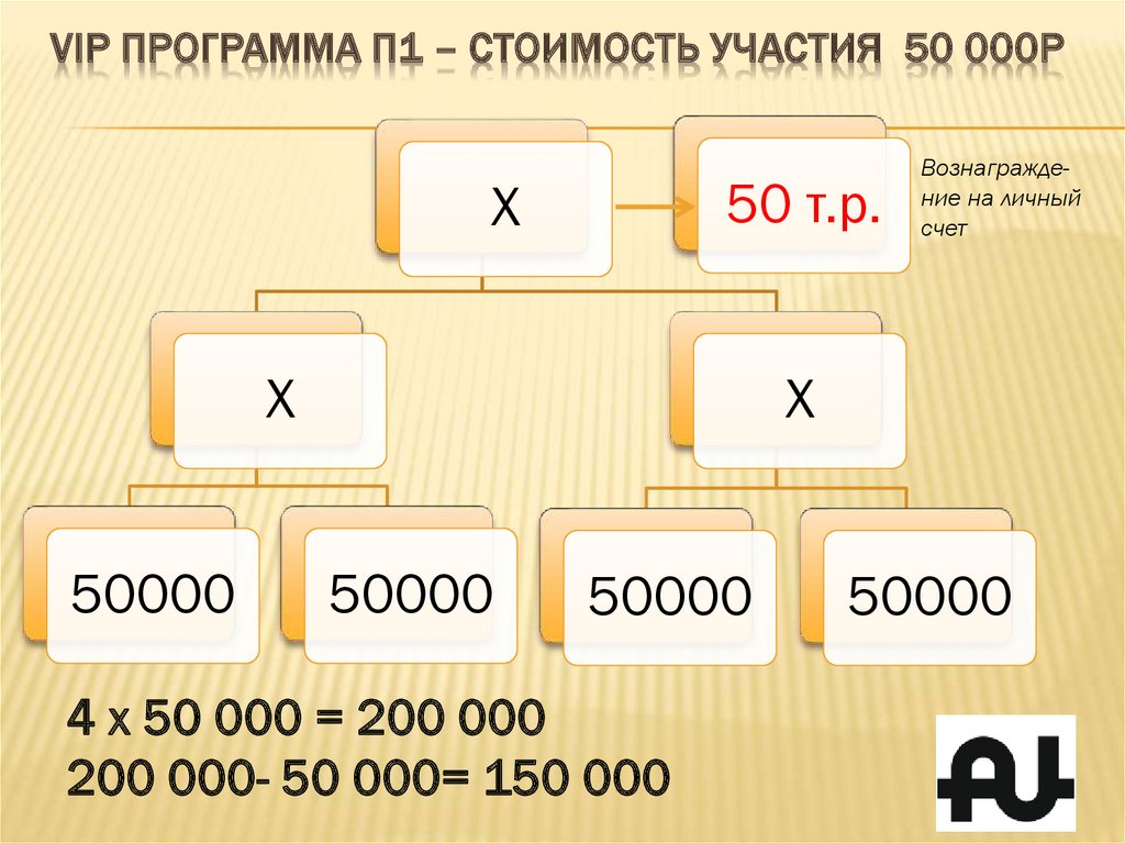 4 x 500 000 = 2 000 000 -500 000 (реинвест VIP П3 за своим