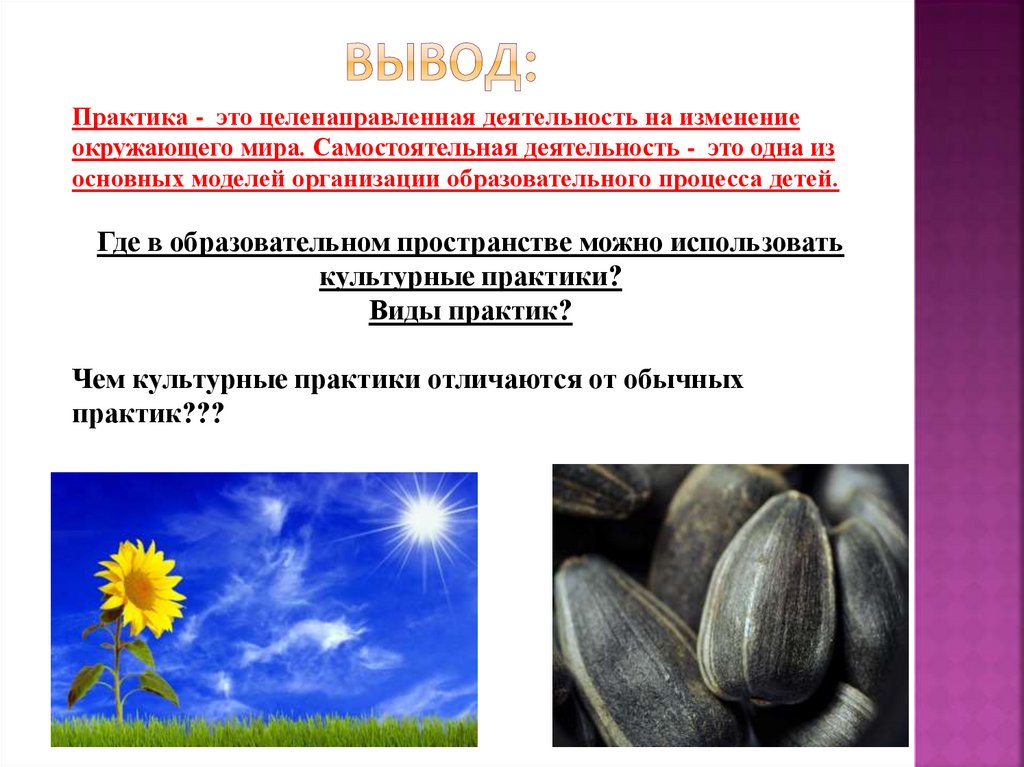 Практика - это целенаправленная деятельность на изменениеокружающего мира. Самостоятельная деятельность - это одна из
