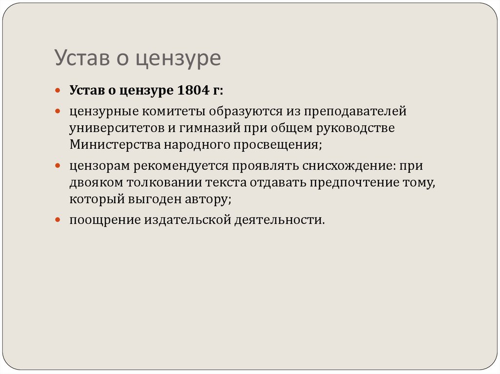 Цензура9 июля 1804 г. был издан «Устав о цензуре»,
