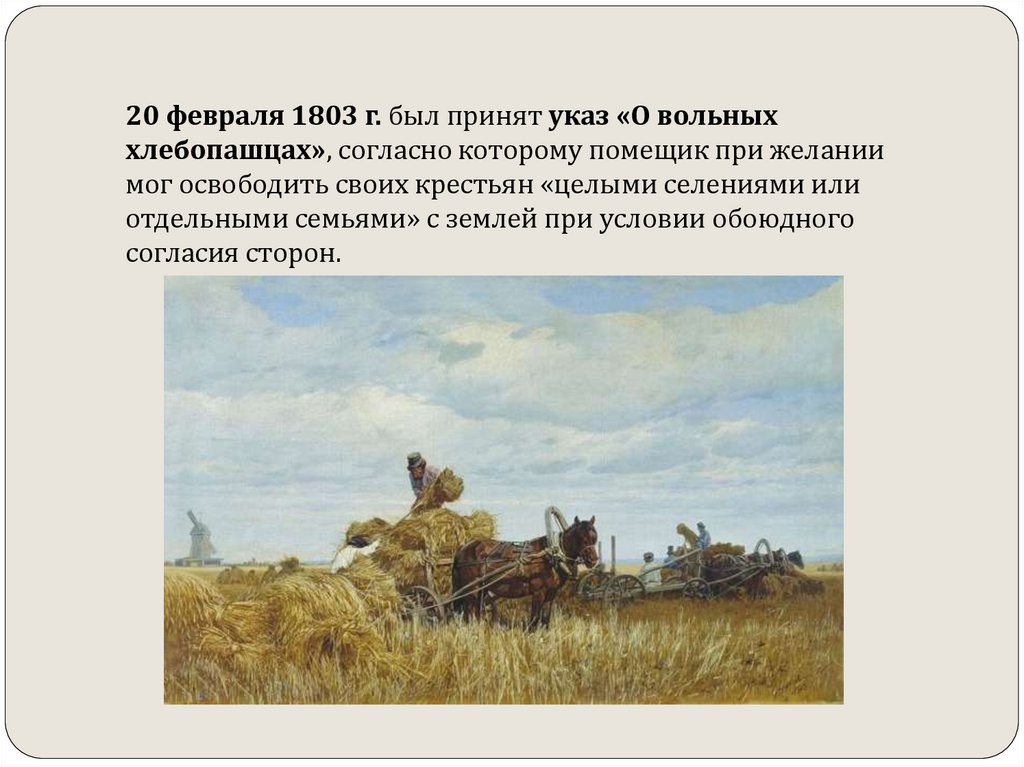 20 февраля 1803 г. был принят указ «О вольныххлебопашцах», согласно которому помещик при желании