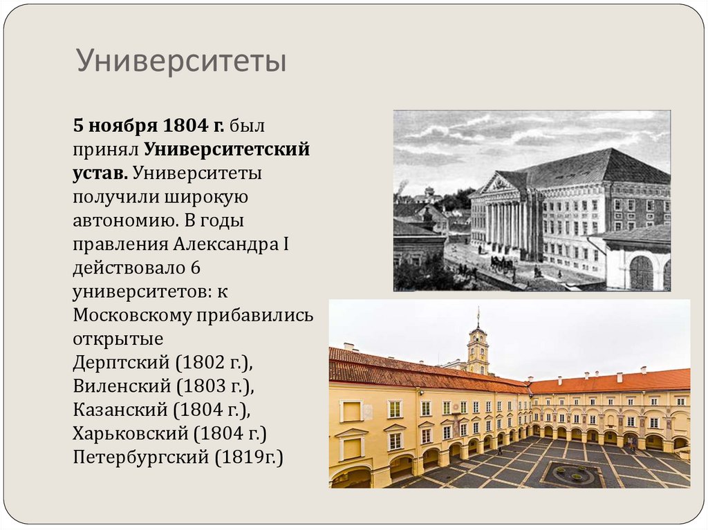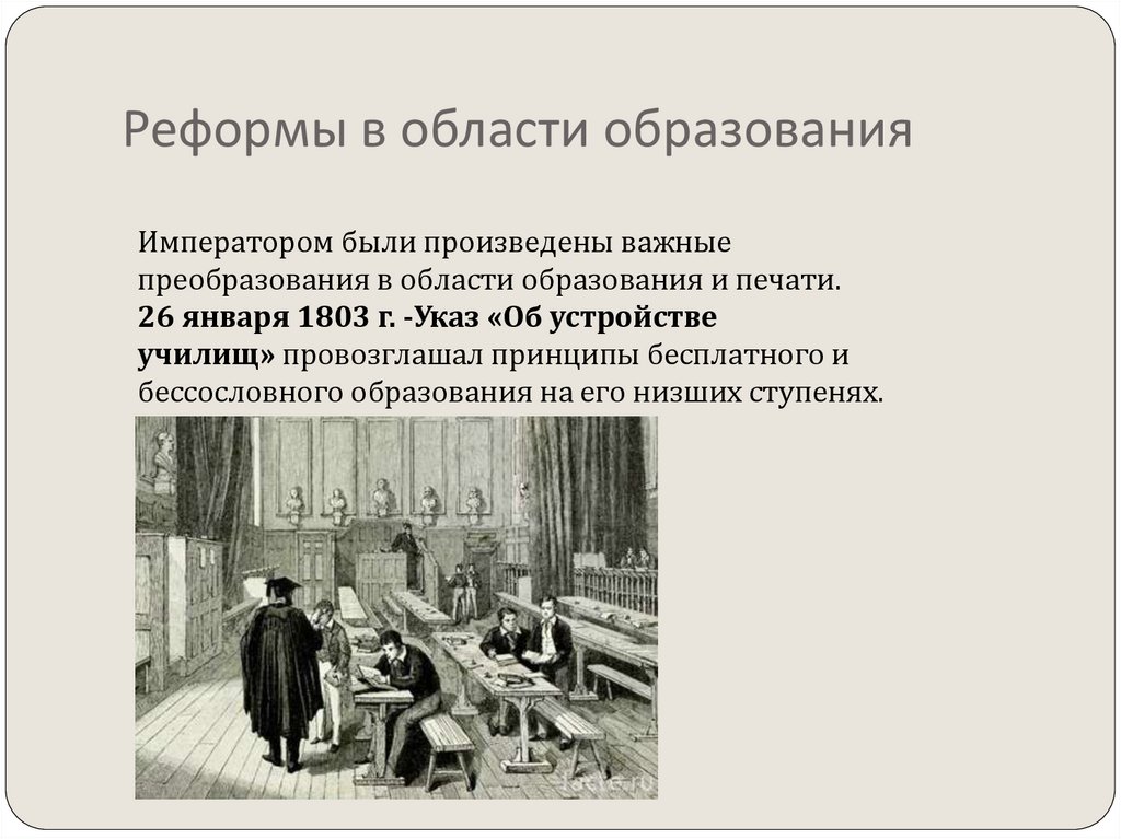 Принципы реформ Александра Iбессословность и бесплатность начального образования;