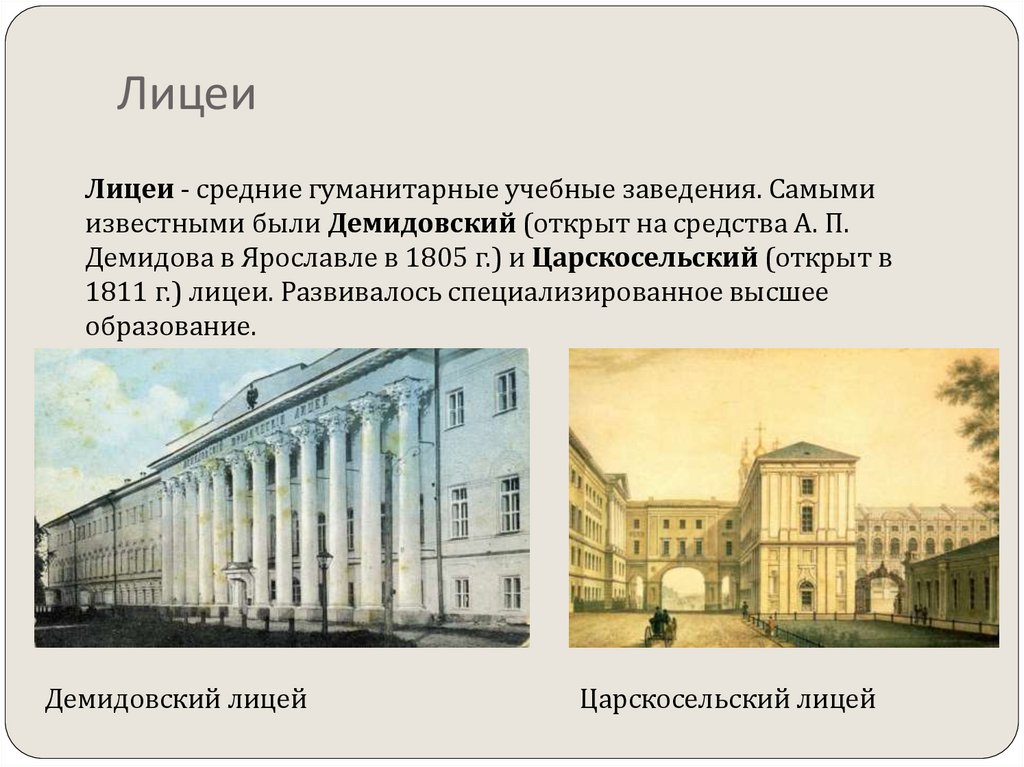 Демидова в Ярославле в 1805 г.) и Царскосельский (открыт в
