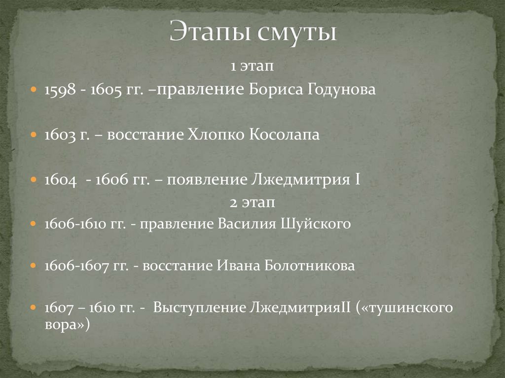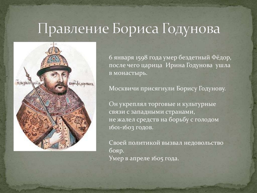 1 этап1598 - 1605 гг. –правление Бориса Годунова