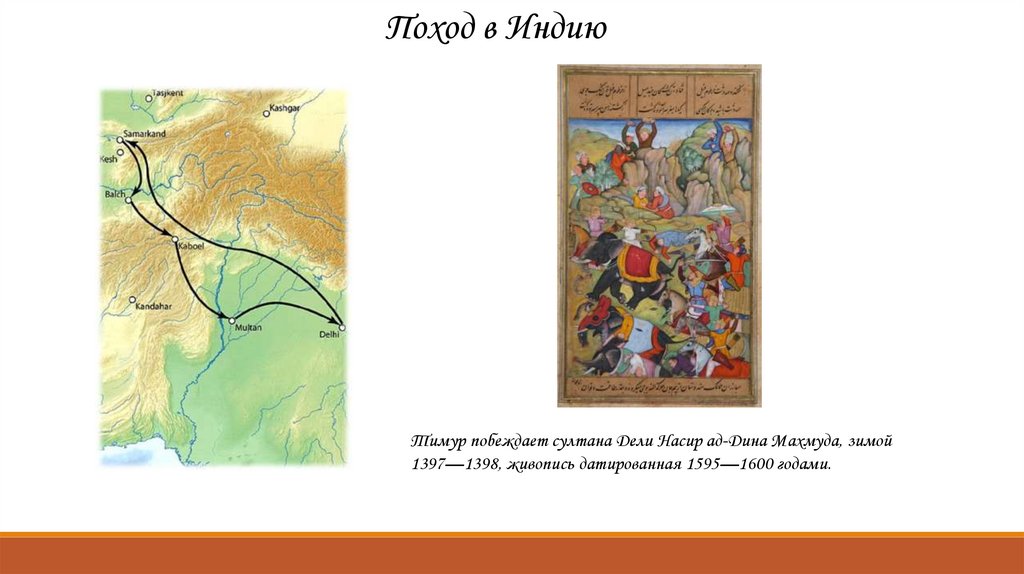 Поход в ИндиюТимур побеждает султана Дели Насир ад-Дина Махмуда, зимой