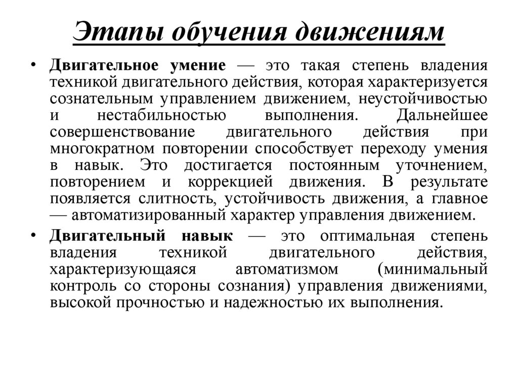 Этапы обучения движениям• Двигательное умение — это такая степень владения