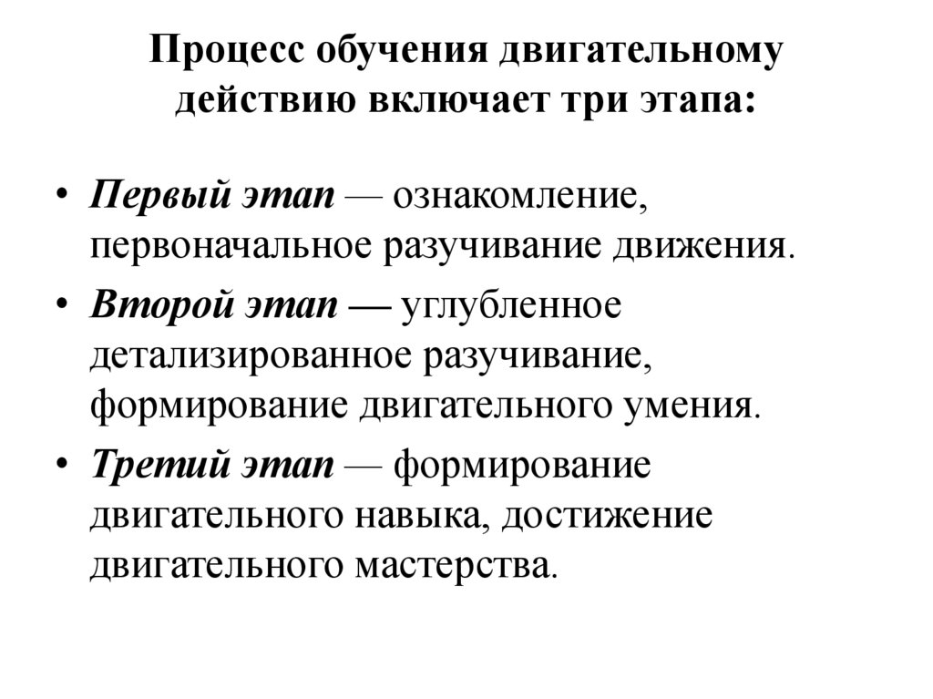 Процесс обучения двигательномудействию включает три этапа: