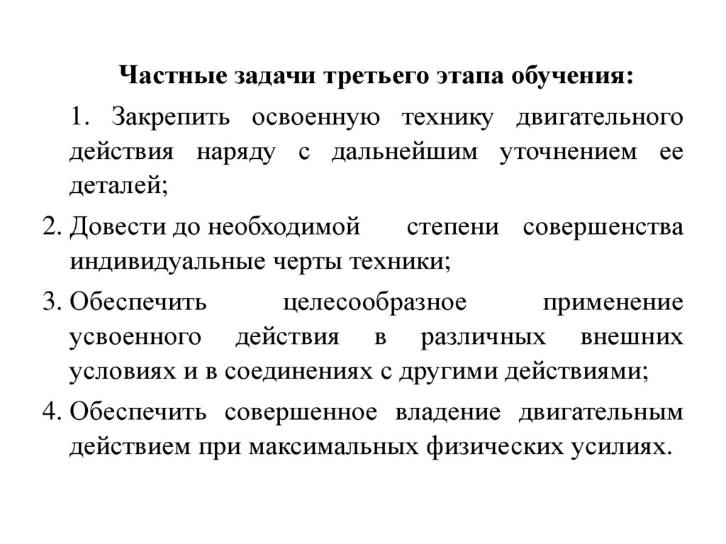 Частные задачи третьего этапа обучения:1. Закрепить освоенную технику двигательного