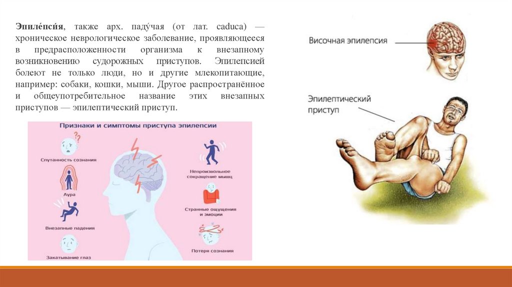 Эпиле́пси́я, также арх. паду́чая (от лат. caduca) —хроническое неврологическое заболевание, проявляющееся