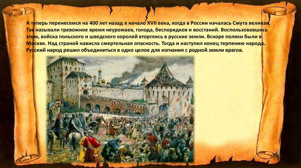 А теперь перенесемся на 400 лет назад в начало XVII века, когда в России началась Смута великая.Так называли тревожное время неурожаев, голода, беспорядков и восстаний. Воспользовавшись
