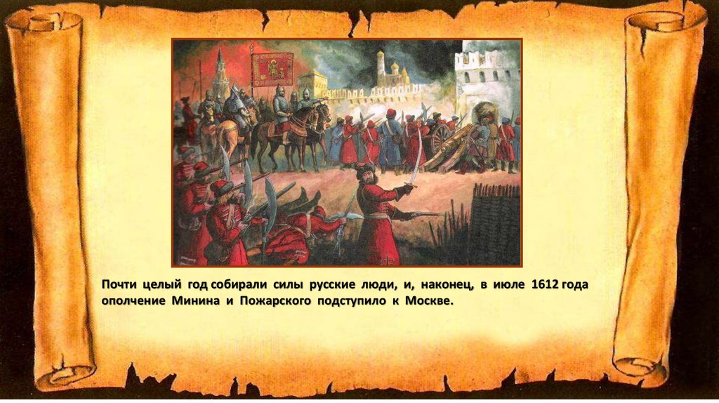 Почти целый год собирали силы русские люди, и, наконец, в июле 1612 годаополчение Минина и Пожарского подступило к Москве.