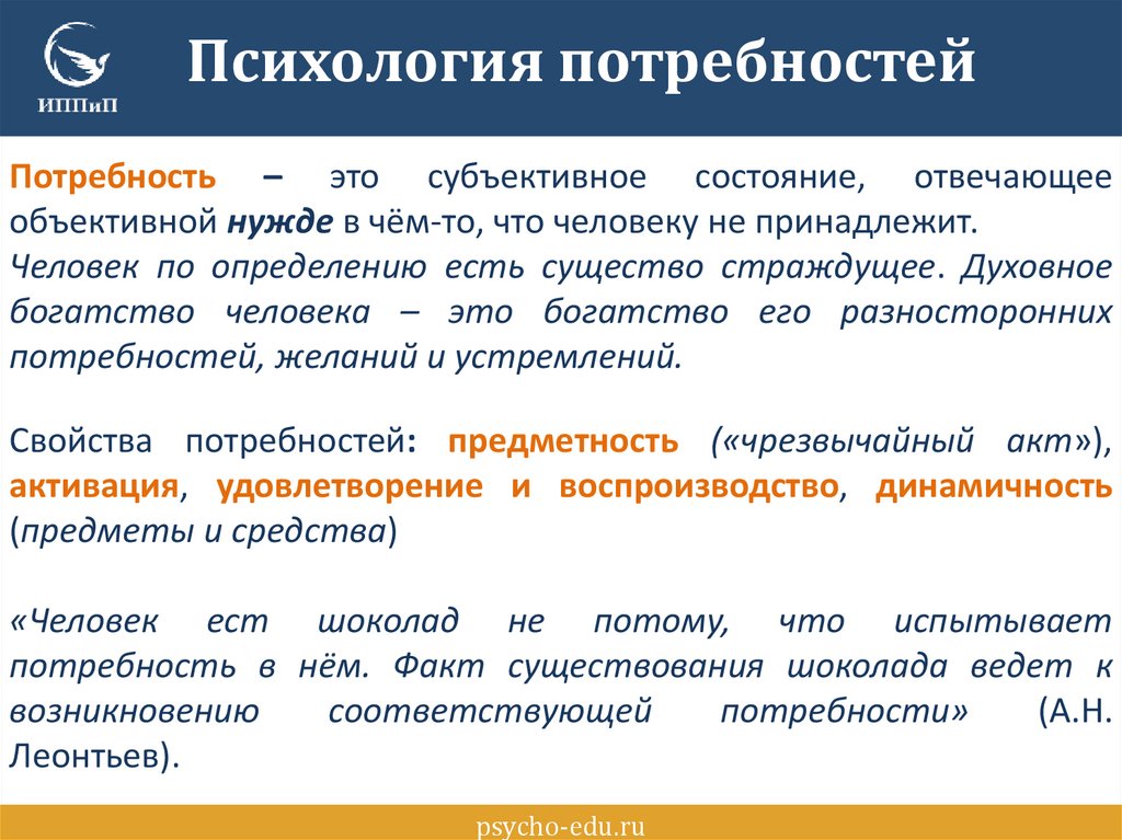 Психология потребностейПотребность – это субъективное состояние, отвечающее