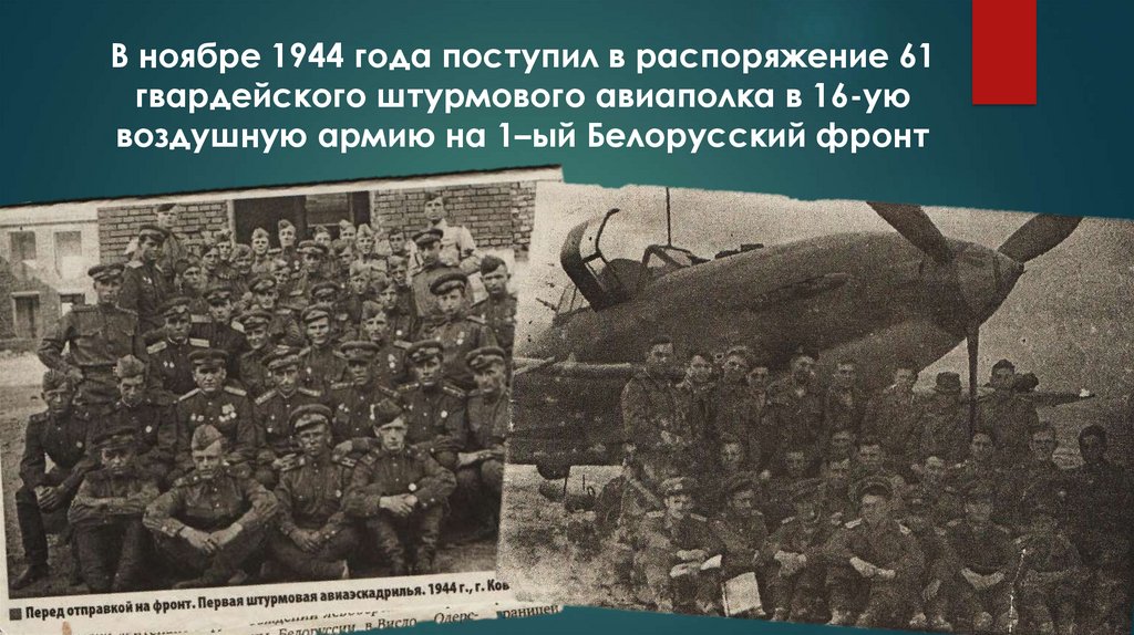 В ноябре 1944 года поступил в распоряжение 61гвардейского штурмового авиаполка в 16-ую