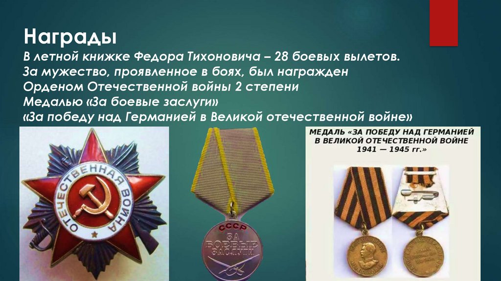 НаградыВ летной книжке Федора Тихоновича – 28 боевых вылетов.