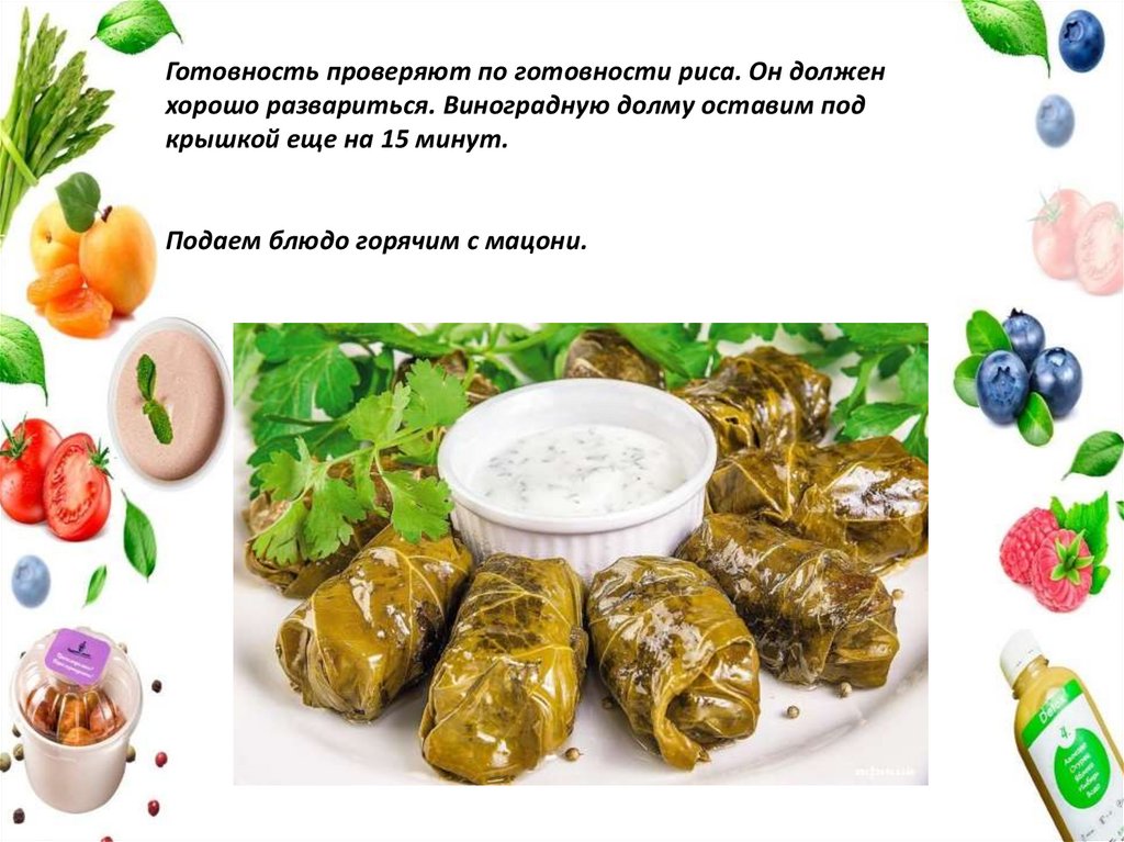 Готовность проверяют по готовности риса. Он долженхорошо развариться. Виноградную долму оставим под
