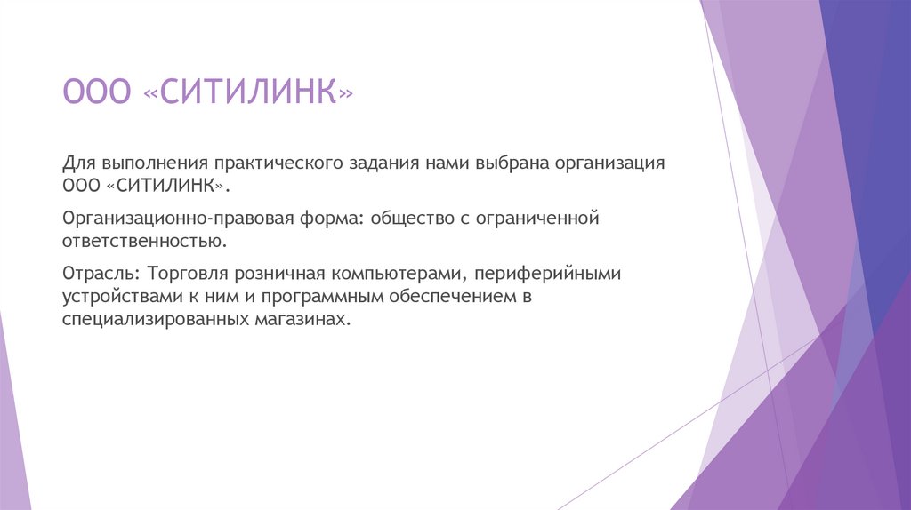 ООО «СИТИЛИНК»Для выполнения практического задания нами выбрана организация