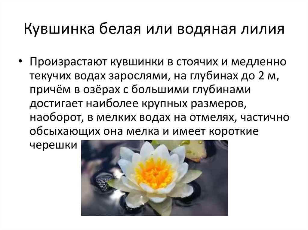 Кувшинка белая или водяная лилия• Произрастают кувшинки в стоячих и медленно