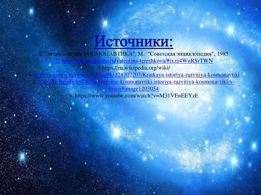 "Энциклопедия КОСМОНАВТИКА", М.: "Советская энциклопедия", 19852.. http://star-magazine.ru/valentina-tereshkova/#ixzz4WnRSrTWN