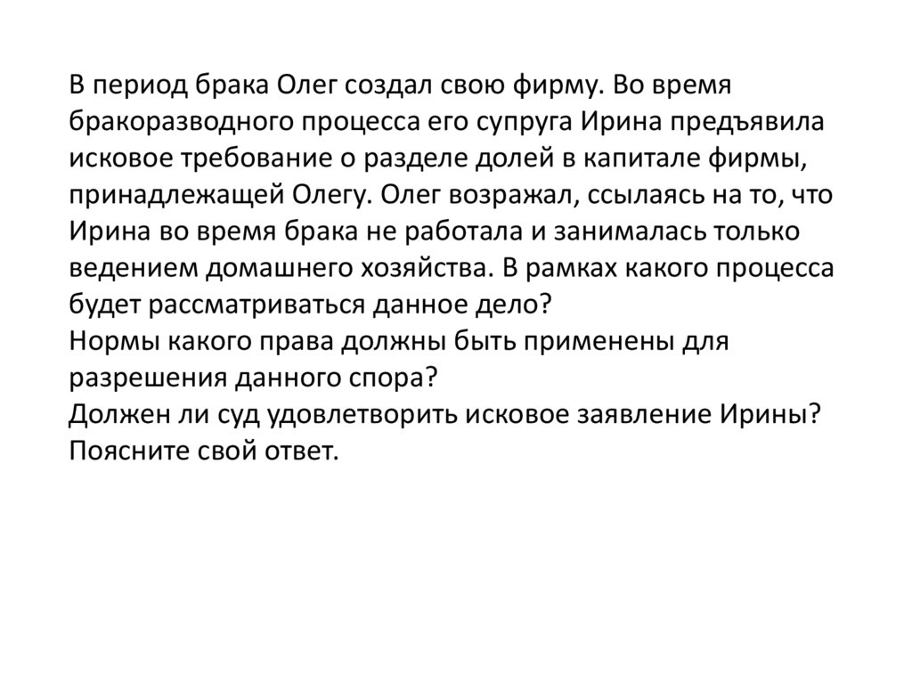 В период брака Олег создал свою фирму. Во времябракоразводного процесса его супруга Ирина предъявила