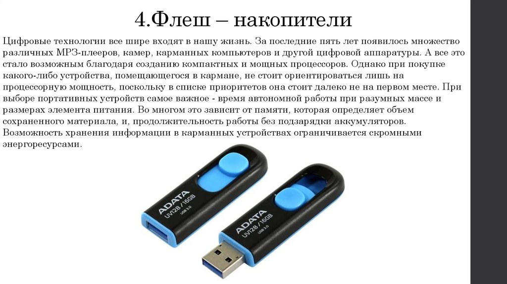4.Флеш – накопителиЦифровые технологии все шире входят в нашу жизнь. За последние пять лет появилось множество