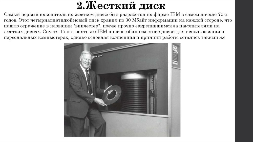 2.Жесткий дискСамый первый накопитель на жестком диске был разработан на фирме IBM в самом начале 70-х