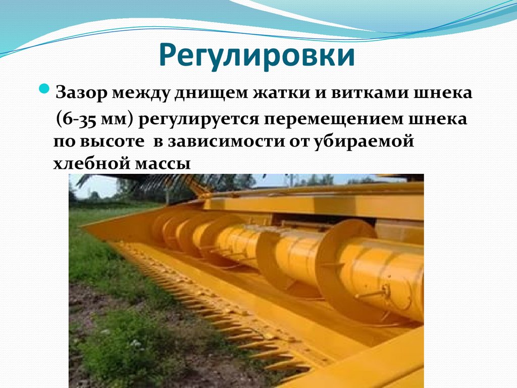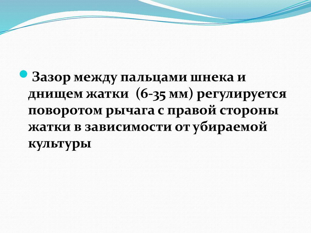 Зазор между пальцами шнека иднищем жатки (6-35 мм) регулируется