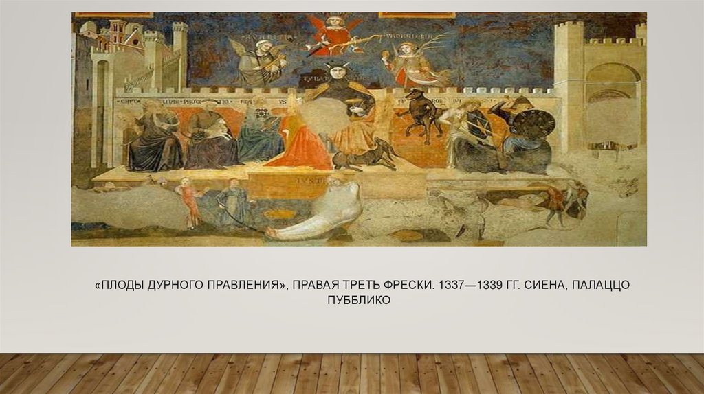 «ПЛОДЫ ДУРНОГО ПРАВЛЕНИЯ», ПРАВАЯ ТРЕТЬ ФРЕСКИ. 1337—1339 ГГ. СИЕНА, ПАЛАЦЦОПУББЛИКО