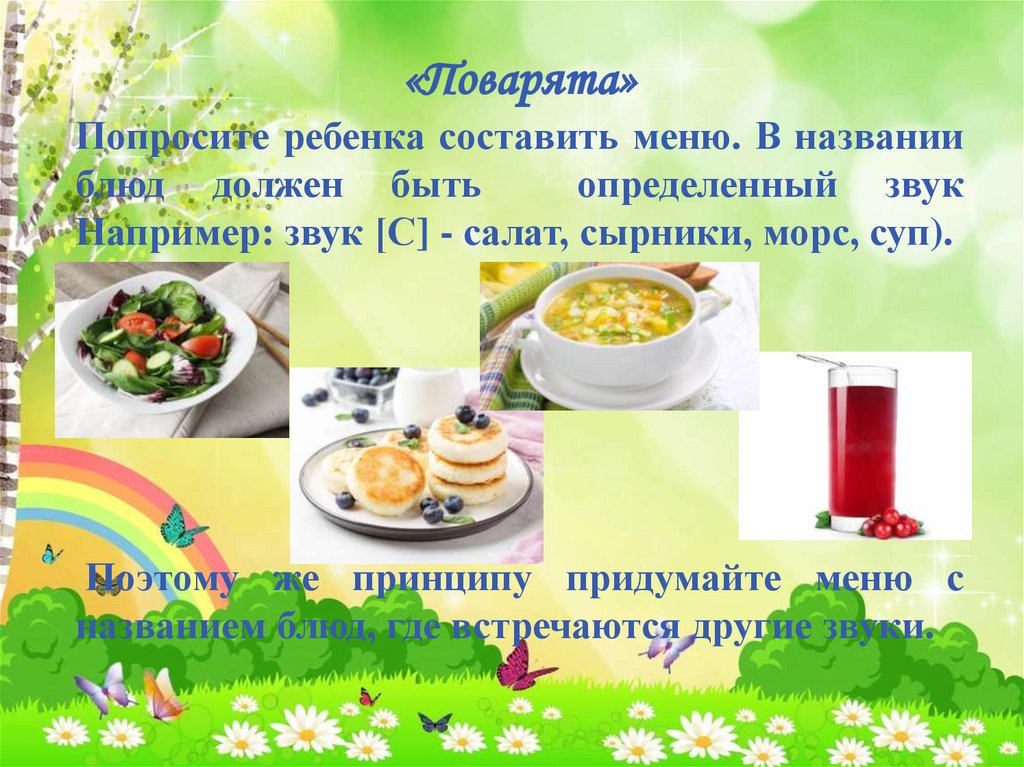 Например: звук [С] - салат, сырники, морс, суп).