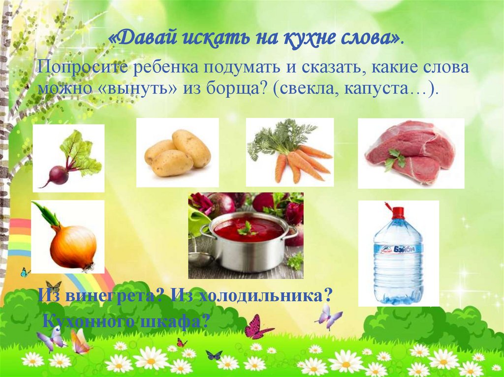 «Давай искать на кухне слова».Попросите ребенка подумать и сказать, какие слова