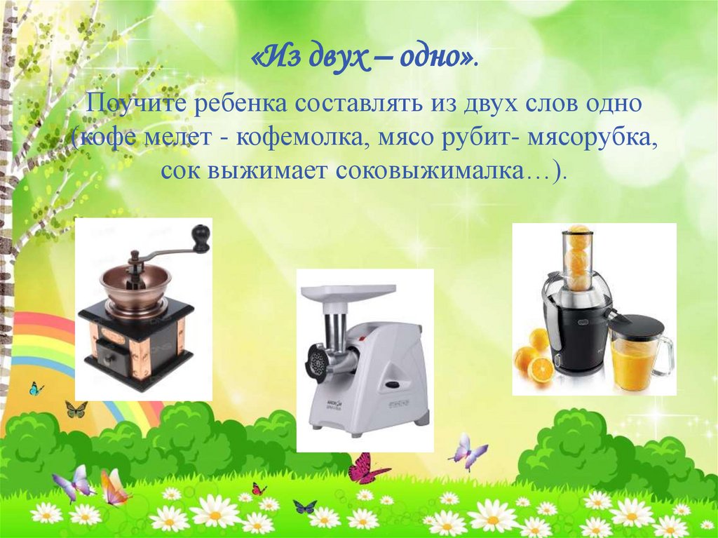 «Из двух – одно».Поучите ребенка составлять из двух слов одно