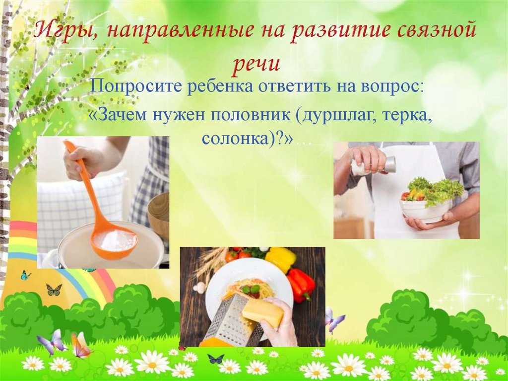 Попросите ребенка ответить на вопрос:«Зачем нужен половник (дуршлаг, терка,