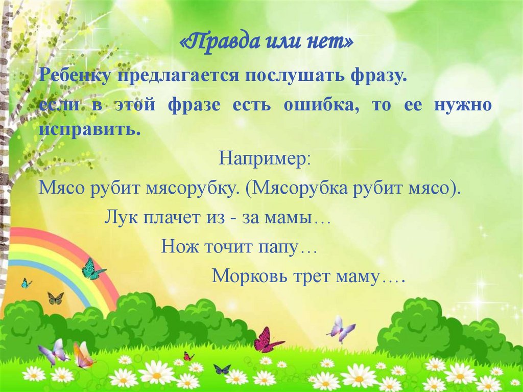 «Правда или нет»Ребенку предлагается послушать фразу.