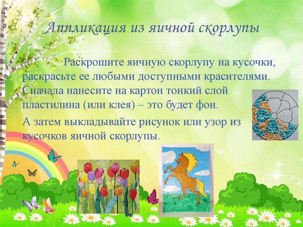 Раскрошите яичную скорлупу на кусочки,раскрасьте ее любыми доступными красителями.