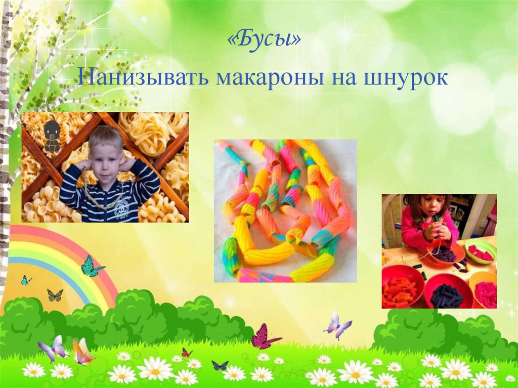 «Бусы»Нанизывать макароны на шнурок