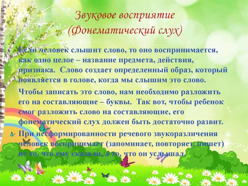 Если человек слышит слово, то оно воспринимается,как одно целое – название предмета, действия,