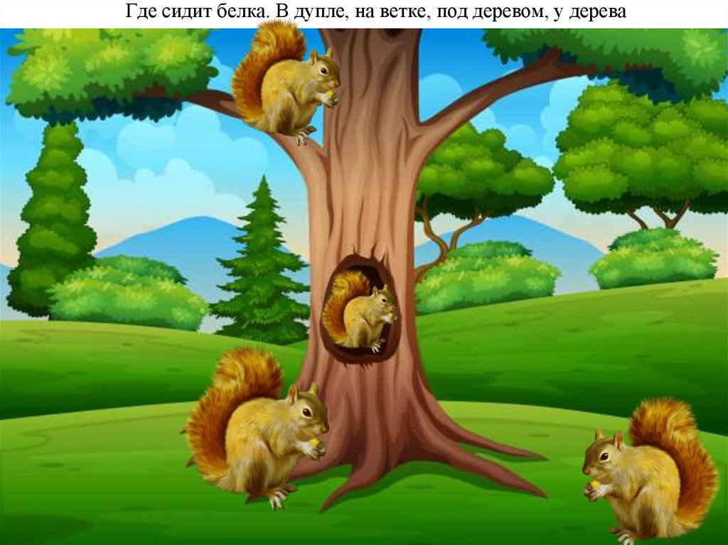 Где сидит белка. В дупле, на ветке, под деревом, у дерева