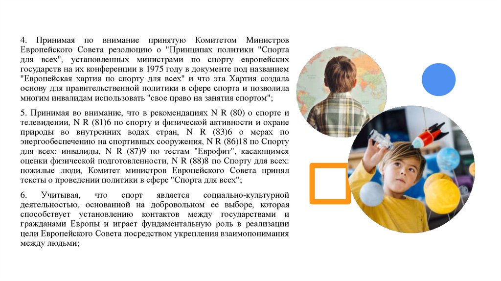 4. Принимая по внимание принятую Комитетом МинистровЕвропейского Совета резолюцию о "Принципах политики "Спорта