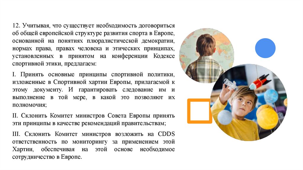 12. Учитывая, что существует необходимость договоритьсяоб общей европейской структуре развития спорта в Европе,