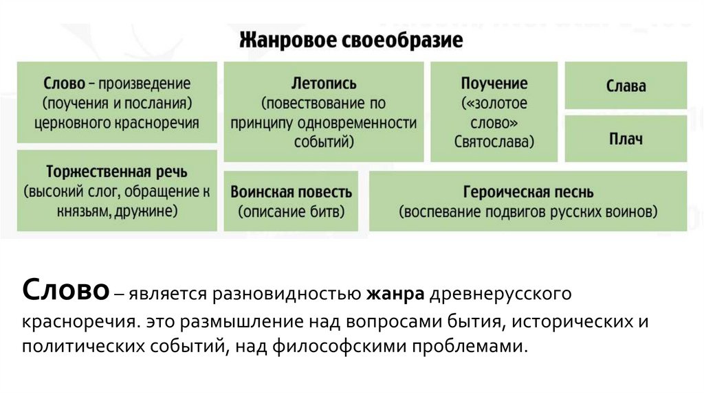 Слово – является разновидностью жанра древнерусскогокрасноречия. это размышление над вопросами бытия, исторических и