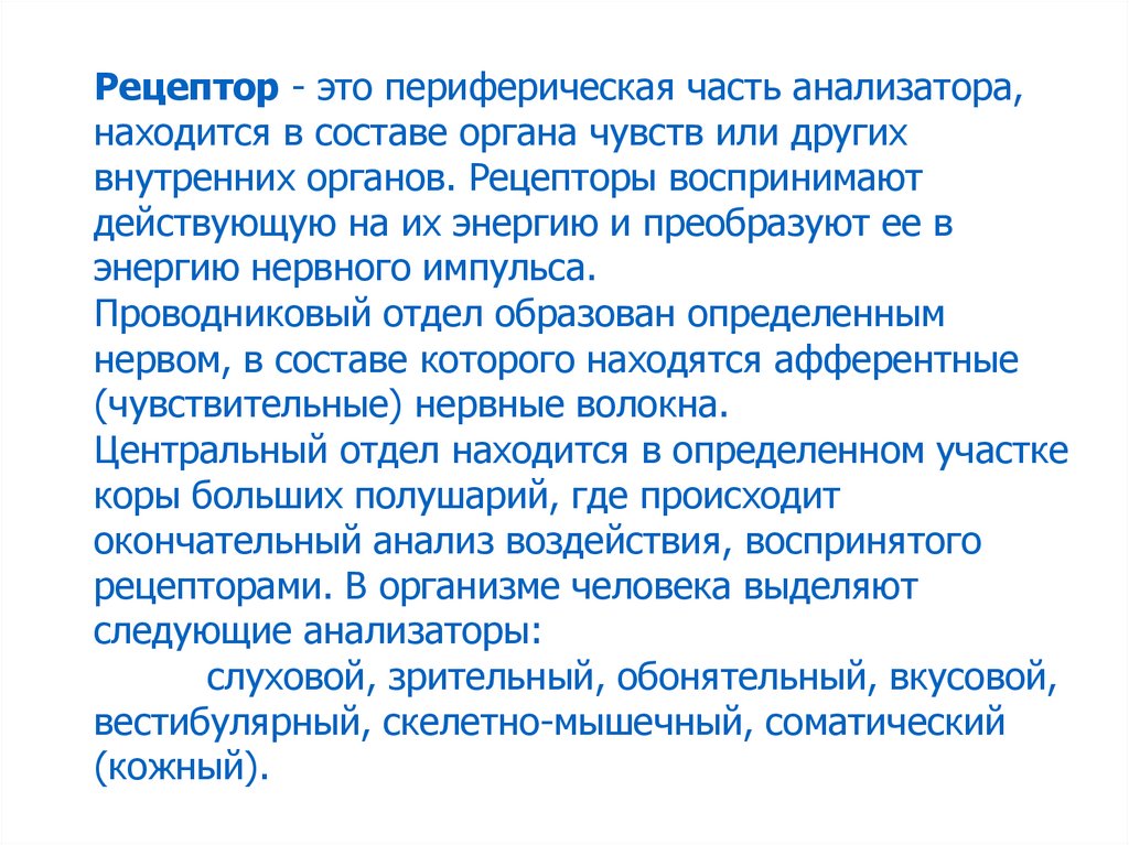 Рецептор - это периферическая часть анализатора,находится в составе органа чувств или других