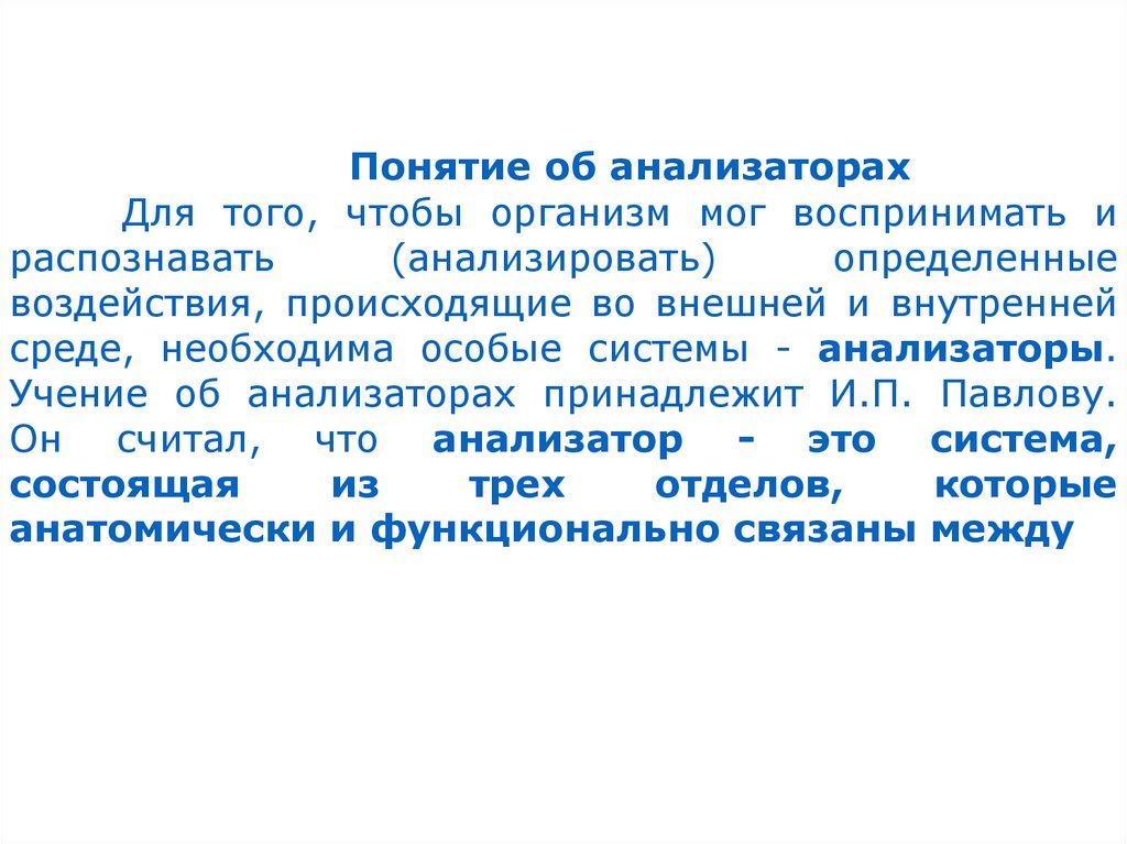 Понятие об анализаторахДля того, чтобы организм мог воспринимать и