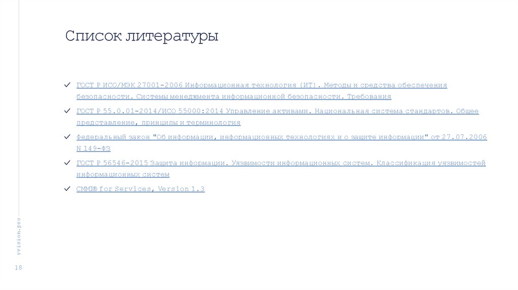 Список литературыГОСТ Р ИСО/МЭК 27001-2006 Информационная технология (ИТ). Методы и средства обеспечения