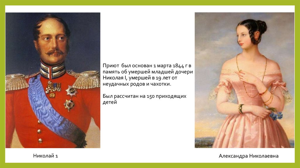 Приют был основан 1 марта 1844 г впамять об умершей младшей дочери