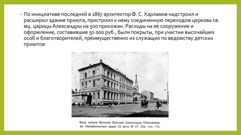 расширил здание приюта, пристроил к нему соединенную переходом церковь св.