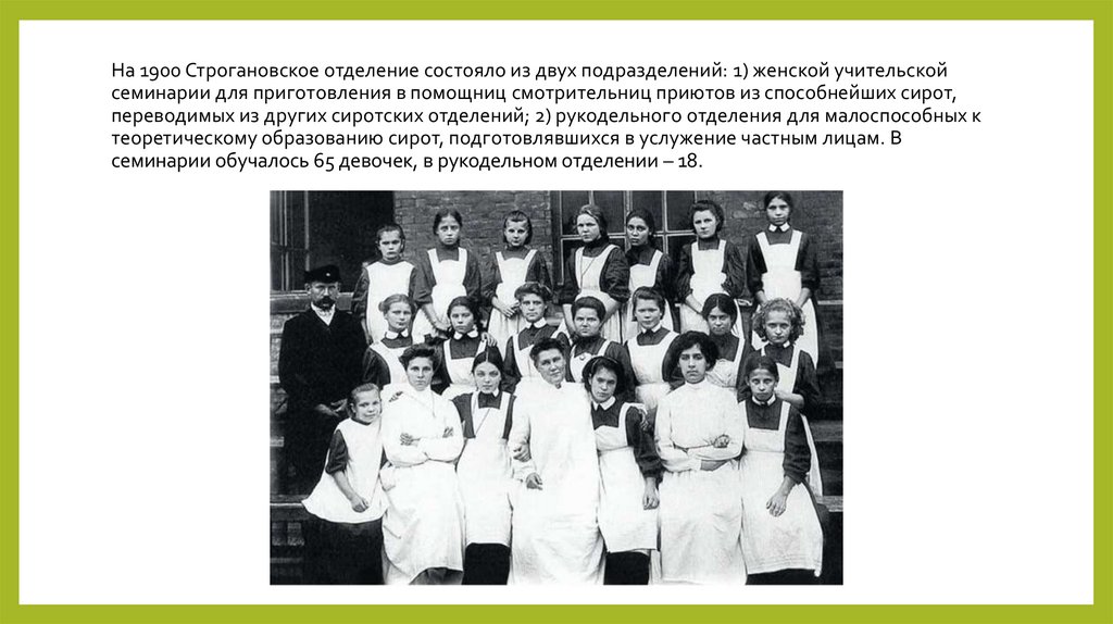 На 1900 Строгановское отделение состояло из двух подразделений: 1) женской учительскойсеминарии для приготовления в помощниц смотрительниц приютов из способнейших сирот,