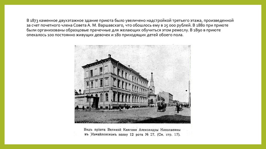 В 1873 каменное двухэтажное здание приюта было увеличено надстройкой третьего этажа, произведеннойза счет почетного члена Совета А. М. Варшавскаго, что обошлось ему в 25 000 рублей. В 1880 при приюте