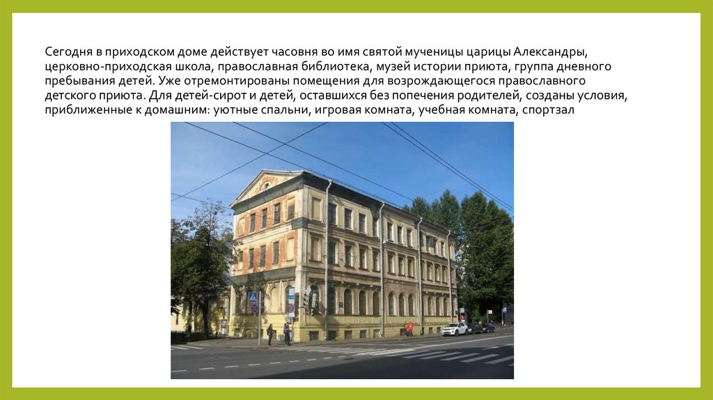 Сегодня в приходском доме действует часовня во имя святой мученицы царицы Александры,церковно-приходская школа, православная библиотека, музей истории приюта, группа дневного