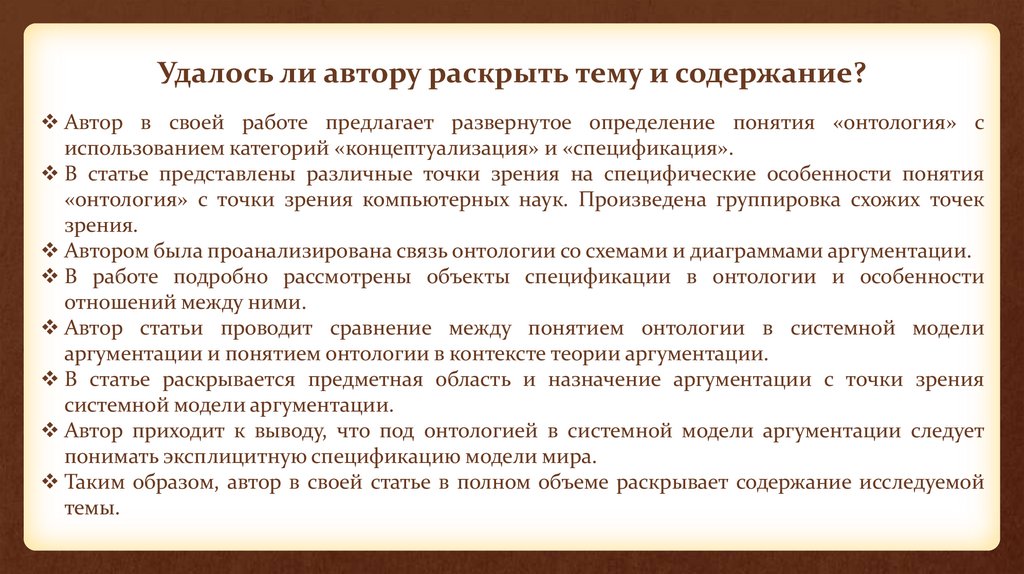 Удалось ли автору раскрыть тему и содержание?Автор в своей работе предлагает развернутое определение понятия «онтология» с