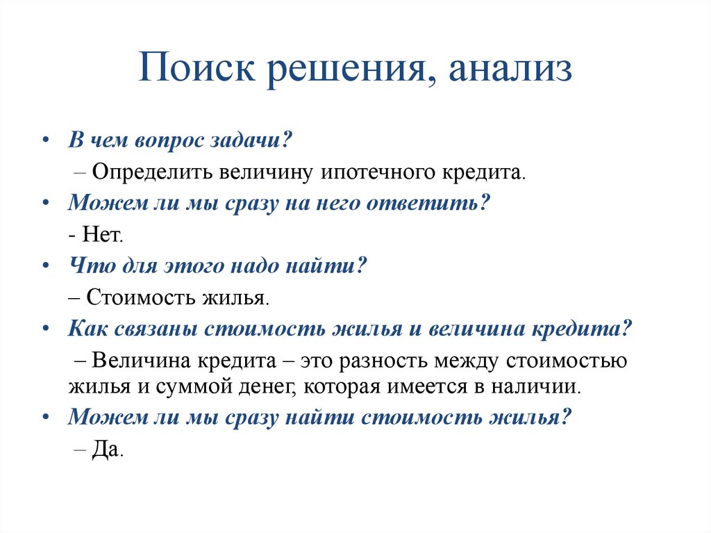 Поиск решения, анализ• В чем вопрос задачи?