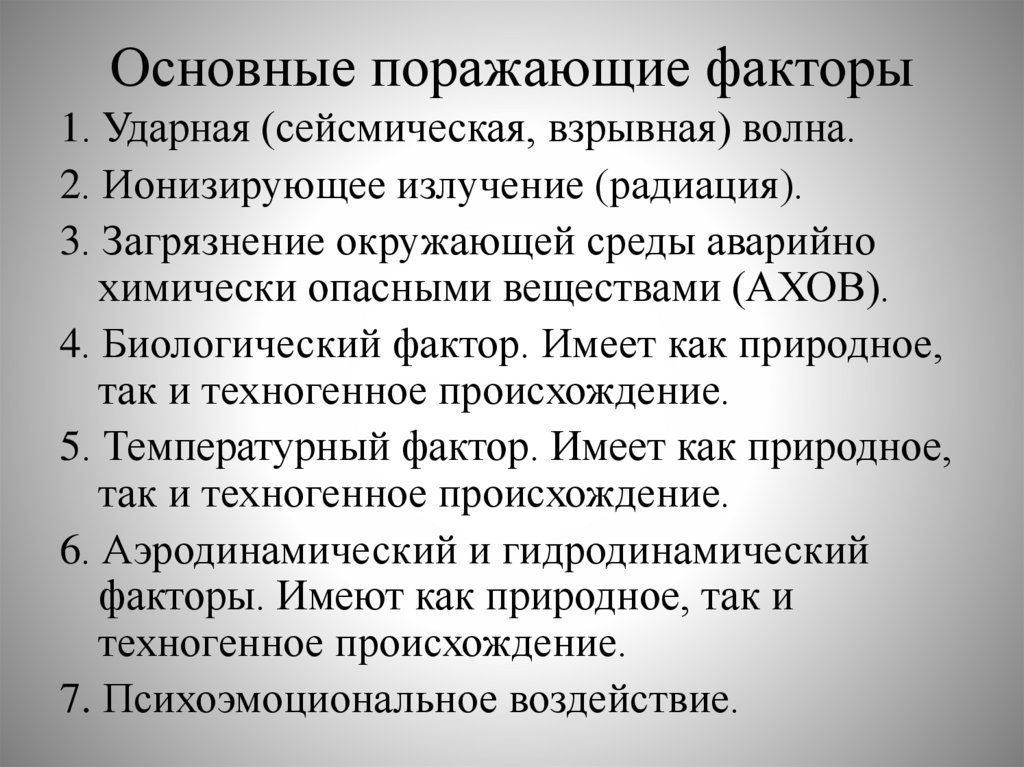 Основные поражающие факторы1. Ударная (сейсмическая, взрывная) волна.